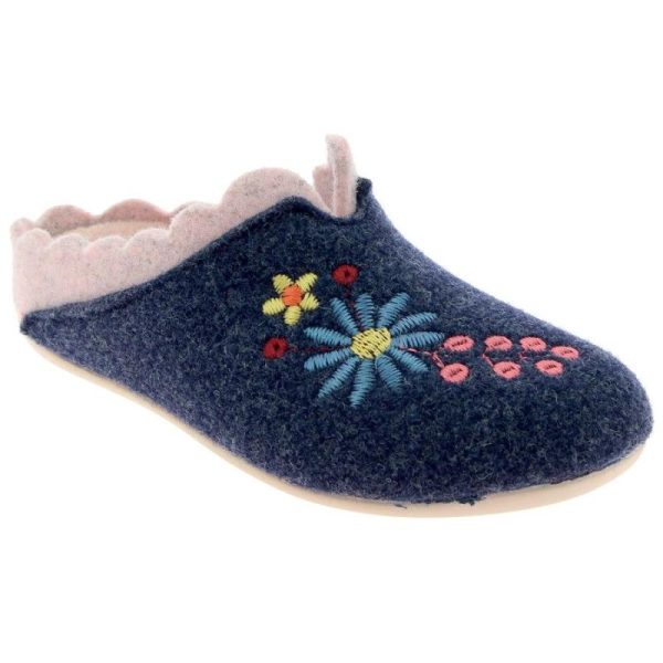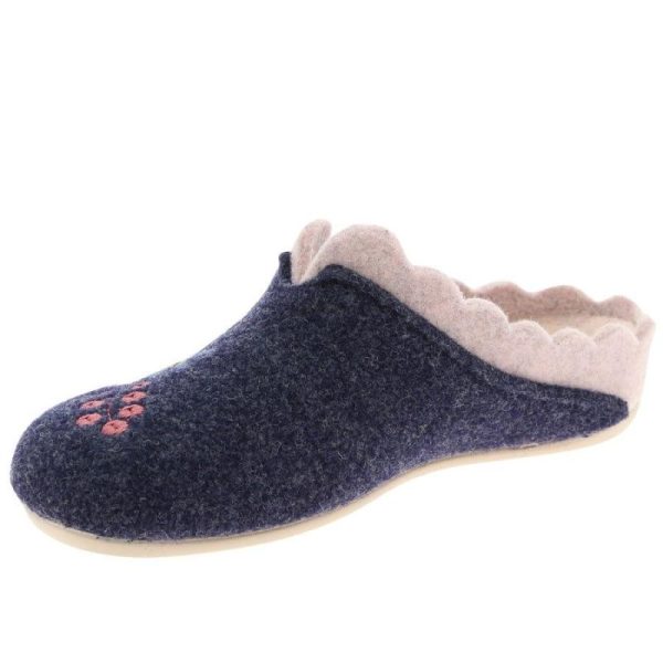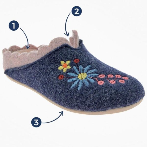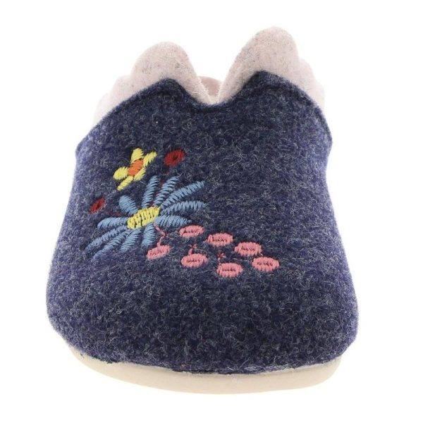 Ce chausson mule marine en laine bouillie comporte une jolie broderie sur l’avant-pied. A noter que la semelle est amovible.