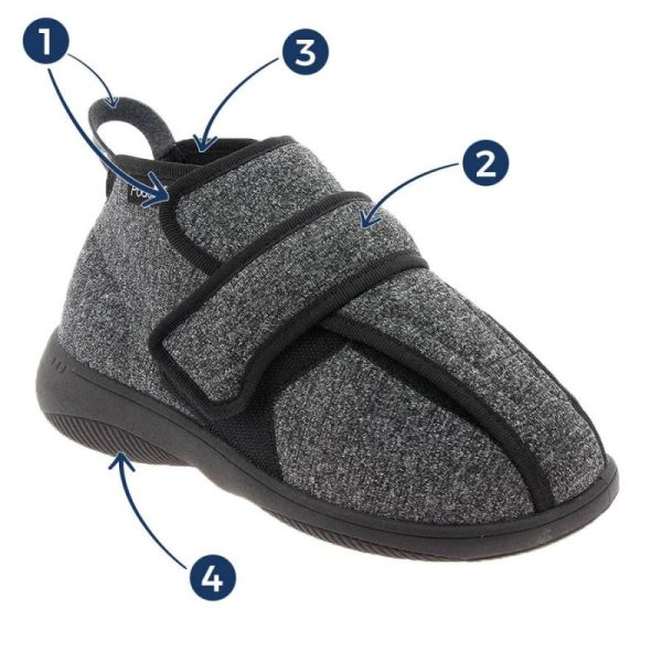 Ce chausson prévu pour une utilisation quotidienne est très facile à enfiler grâce à une ouverture totale du dessus. Très pratique, il se règle par une bride auto-agrippante et est lavable en machine, de même que sa première de confort amovible.
