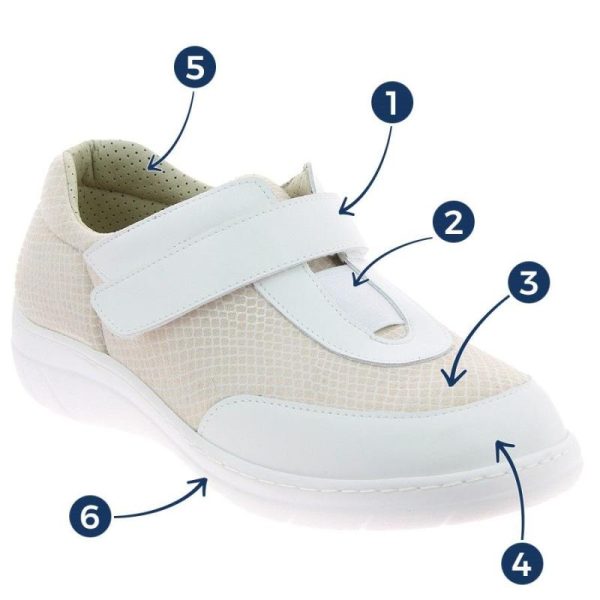 Cette chaussure au look très sport est dotée d’une semelle anti-dérapante. Son dessus en tissu extensible épouse parfaitement la forme du pied. De plus, sa semelle intérieure est amovible et remplaçable par une semelle sur mesure. Une longue bride réglable facile à saisir et à ajuster permet d’enfiler rapidement et simplement la chaussure tout en maintenant parfaitement le pied.