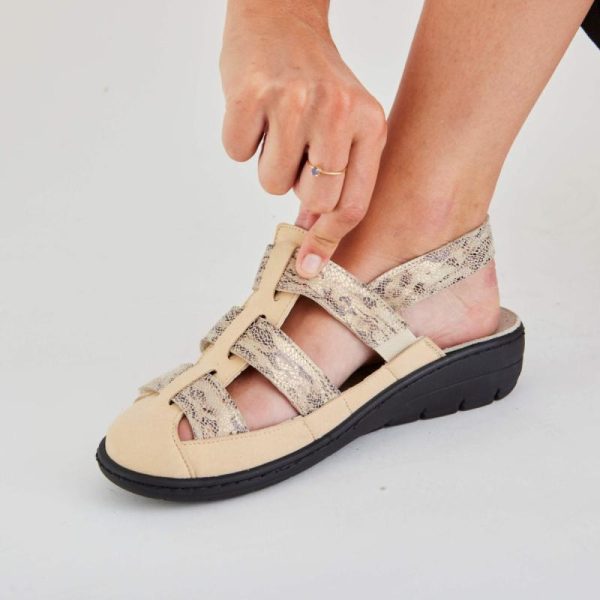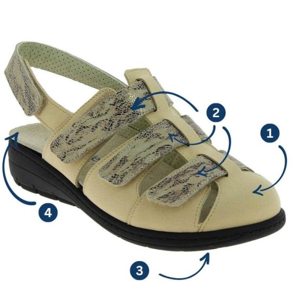 La Giselda beige est une sandale orthopédique technique et confortable. Le bout avant est fermé pour protéger les orteils fragiles et offre un grand volume, s’adaptant ainsi aux déformations des orteils. Elle se chausse facilement par ses 3 brides auto-agrippantes, qui offrent une large ouverture et permettent de l’ajuster précisément. Les brides sont également élastiquées au niveau de la semelle pour accueillir les pieds très volumineux. C’est la sandale faite pour marcher en toute tranquillité, de par sa légèreté, sa stabilité et sa semelle antidérapante.